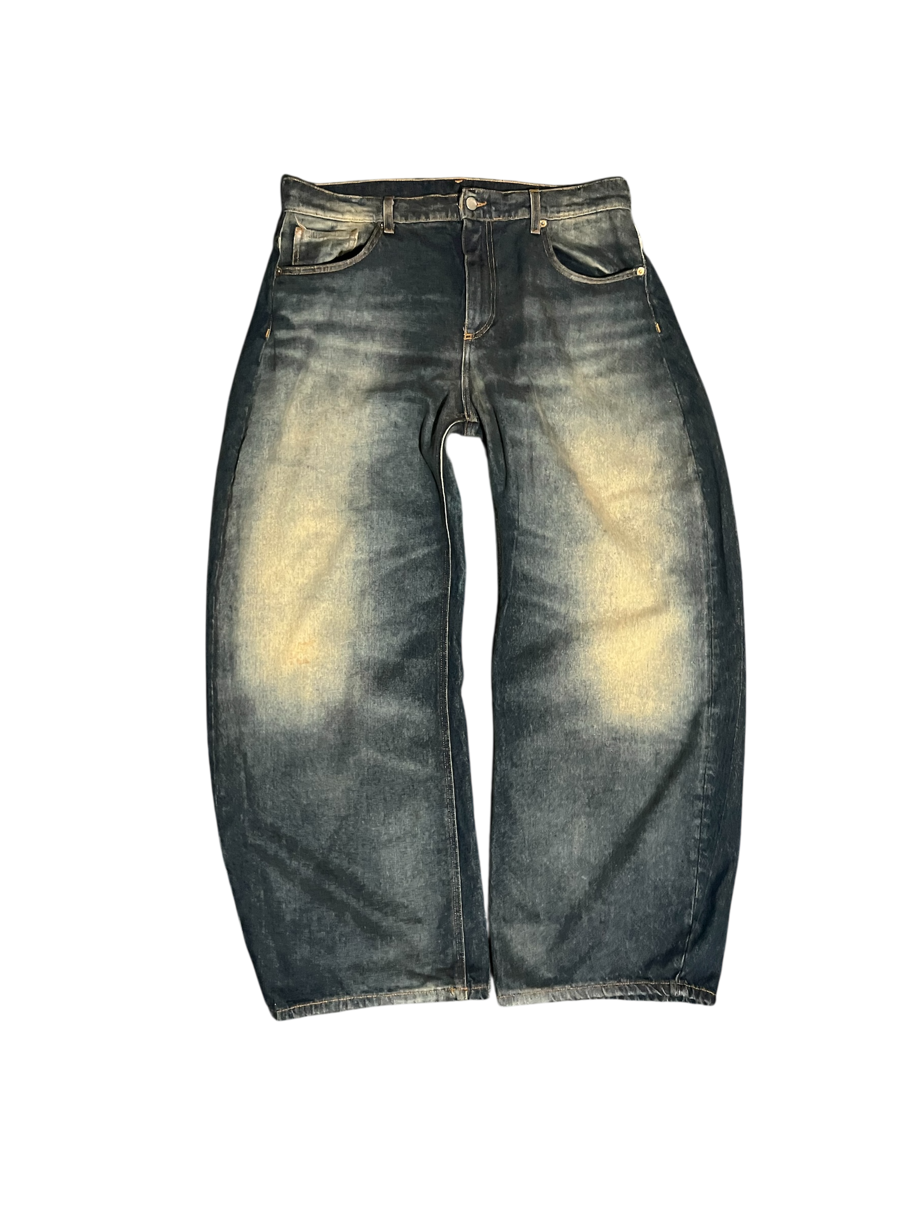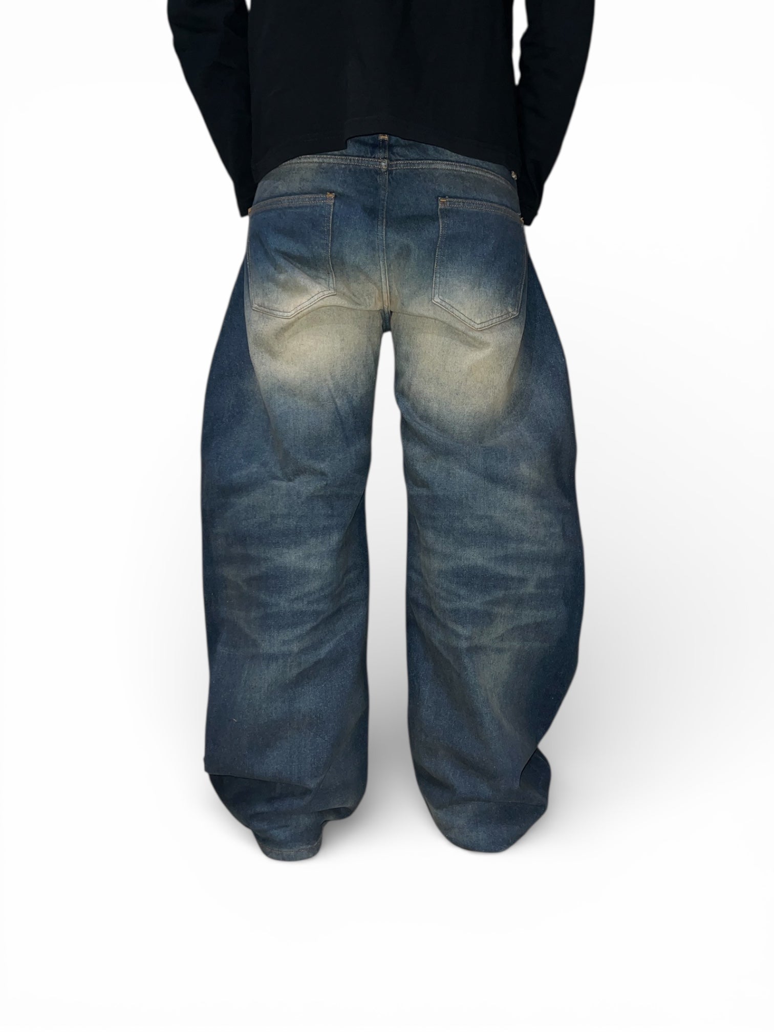 Lavaggio scuro con baffature laser e aloni localizzati effetto vintage ruggine.